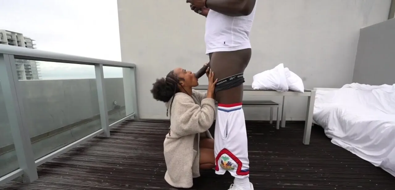 Ebony beauty kneels before the BBC in a charming oral display, and gently moaning like a slut, she begins to engulf the monster cock until sperm starts to splash all over her face.
